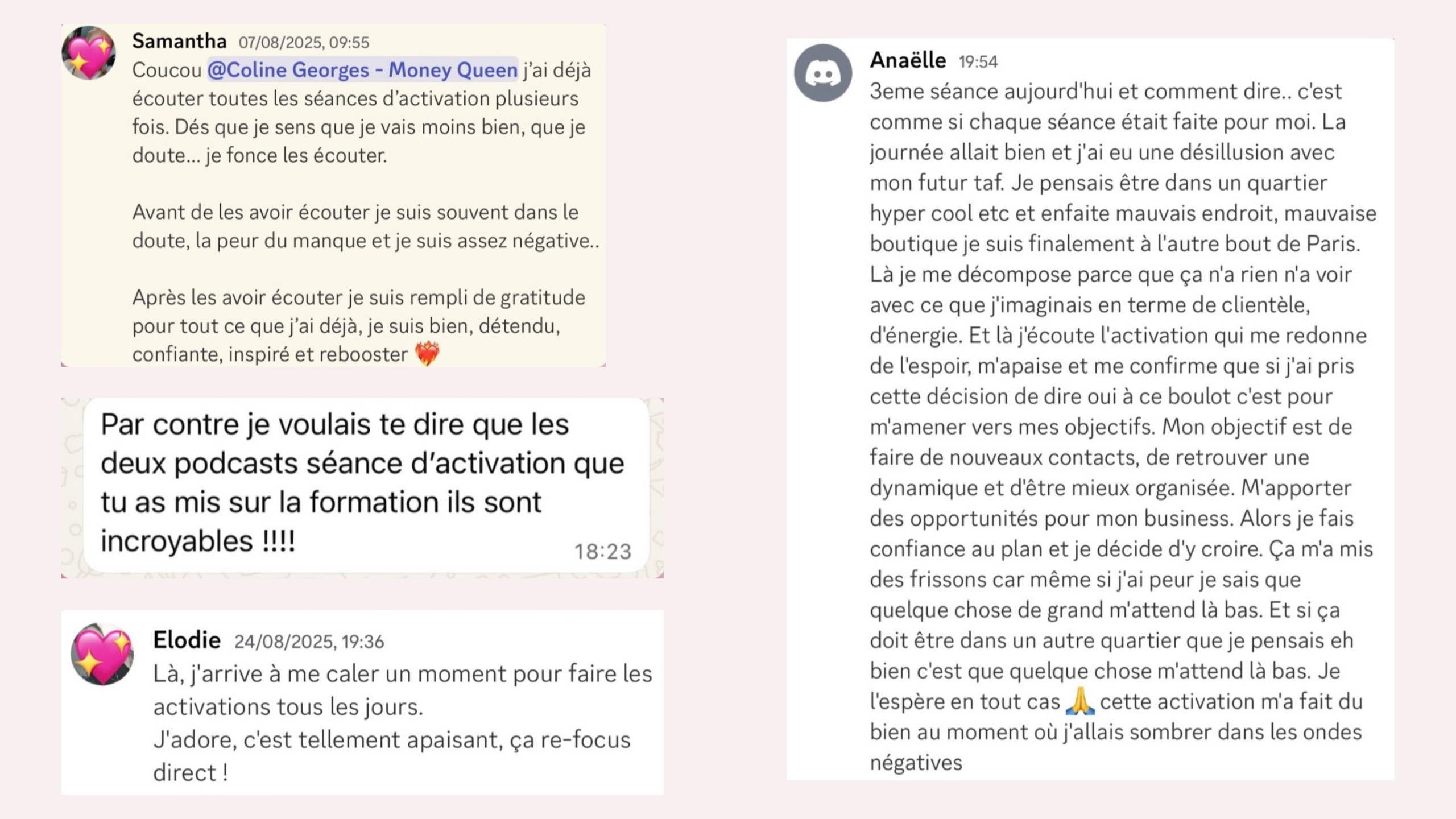 Tu écoutes, tu te laisses guider, et ton esprit fait le reste. Il est conseillé de faire au moins une séance par jour, celle qui t’appelle le plus. Souvent après 15 jours, mes clientes commencent à ressentir de vrais changements. Et dans un mois… ta relation à l’argent ne sera plus jamais la même.