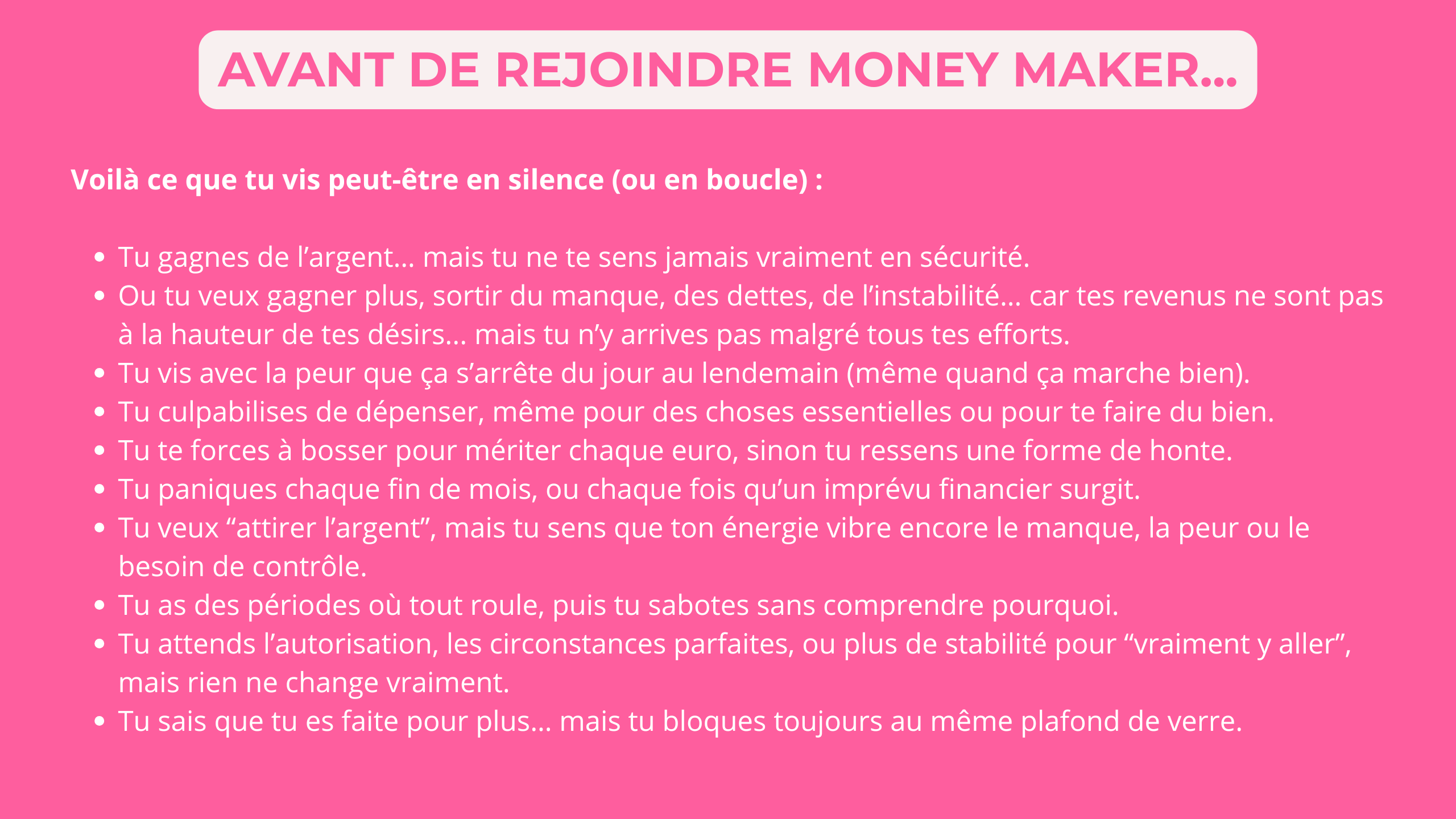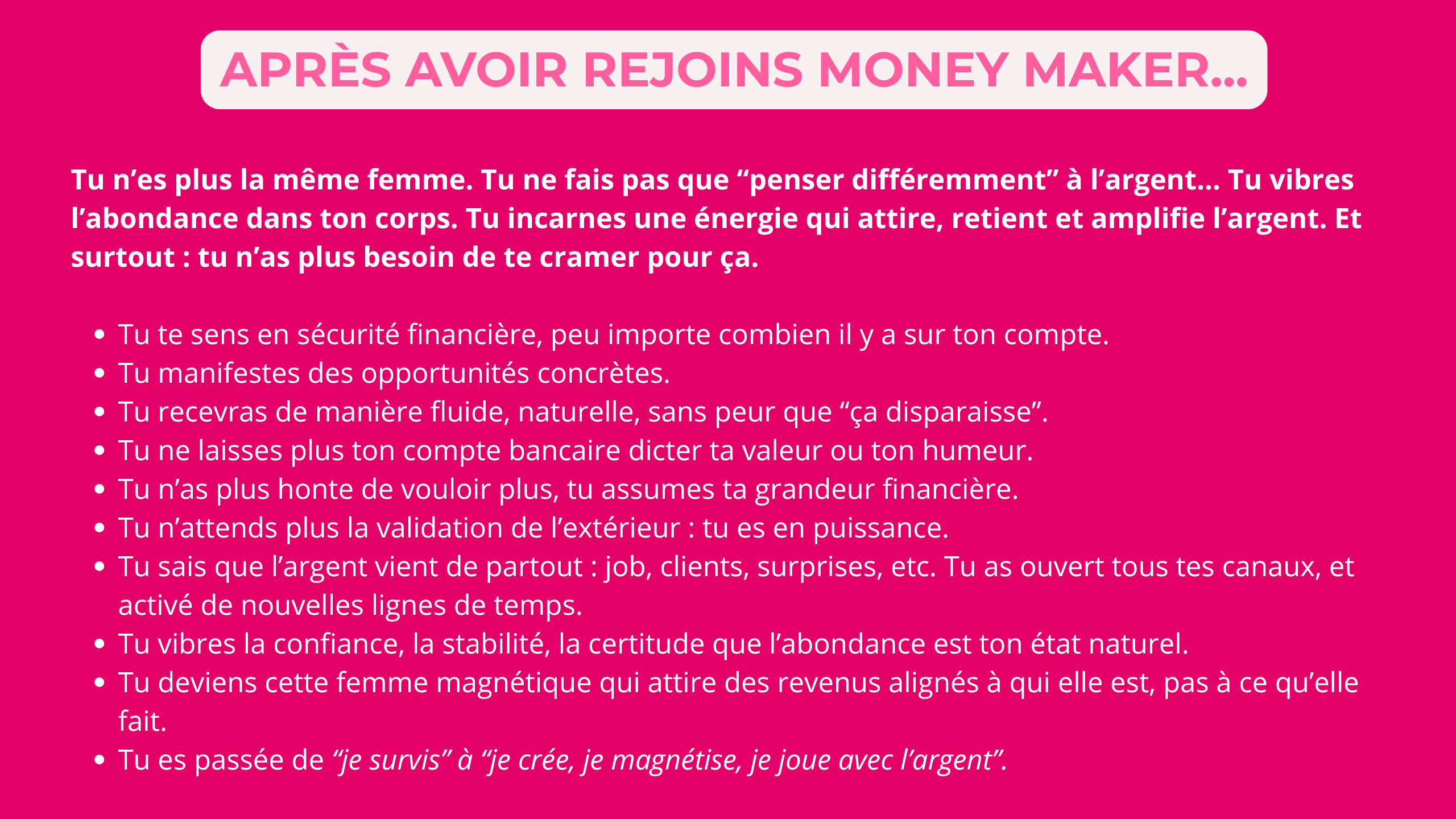 Peu importe où tu en es aujourd’hui, si tu es prête à changer ton état d’esprit et à ouvrir tes canaux, MONEY MAKER est la transformation qu'il te faut.